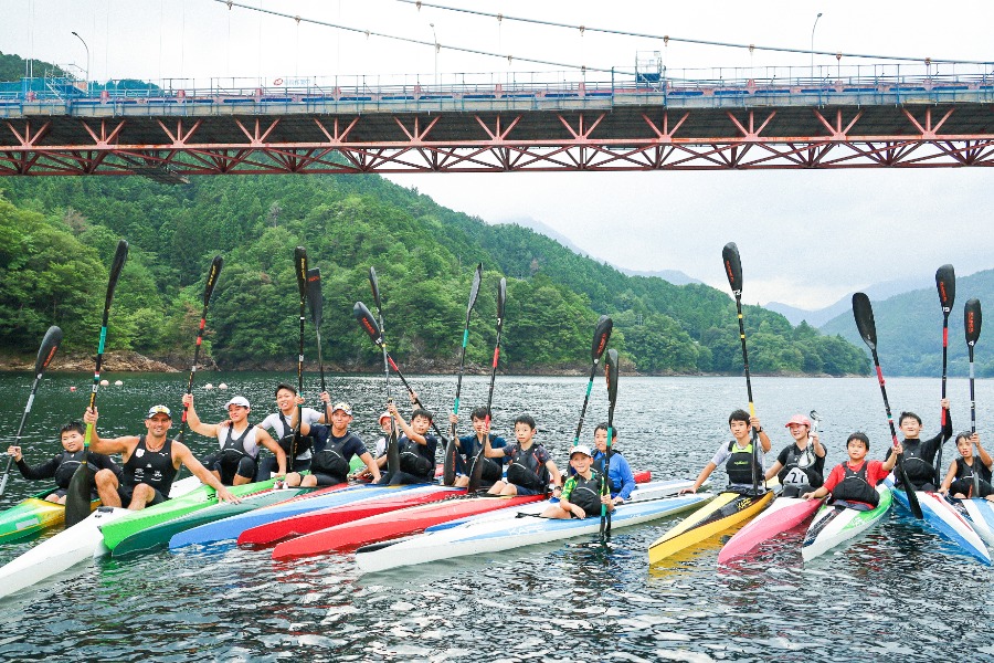山に囲まれ風の影響を受けにくい早明浦湖。また、さめうらカヌーテラス内にはカヌー艇庫、トレーニングジム、国内初のハンガリー式パドルプールも備えてあり、充実した環境の中カヌーをしています。2025年から元日本代表選手の山本結花氏を外部指導員に迎え、地域おこし協力隊含む4名のコーチ体制で活動しています。
